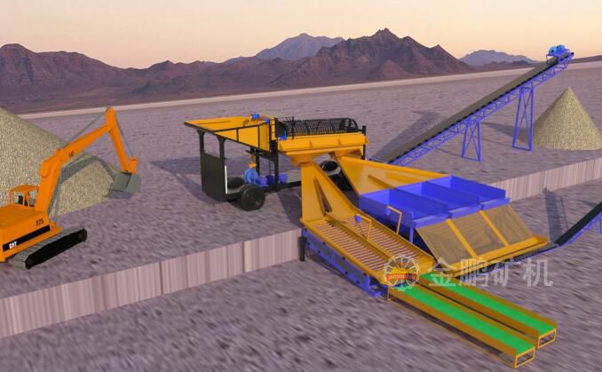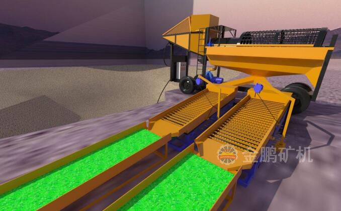 原礦通過礦用自卸車運輸?shù)竭x金車礦倉,礦倉上設(shè)有格篩防止大塊礦石進入到分級洗礦篩對篩子造成危害,礦石在篩子內(nèi)通過高壓水的沖洗使礦石、泥土、顆粒金分開。篩上產(chǎn)品通過皮帶運輸機直接運輸?shù)綇U料堆廠,篩下產(chǎn)品經(jīng)過鼓動溜槽先進行富集,然后再自流至固定溜槽進一步回收有價金,通過兩次選別作業(yè)顆粒金的回收率可高達70%以上。我公司生產(chǎn)的移動式砂金選礦車解決了原來固定式運輸成本高的弊病更適合旱地選金。