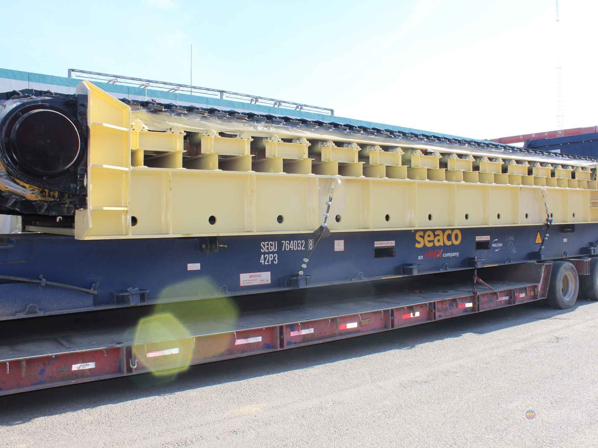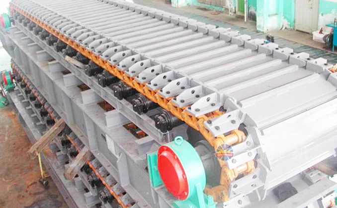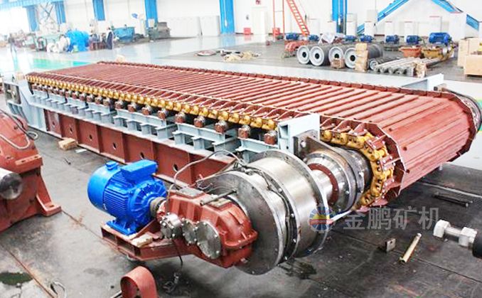 采用節(jié)距為200mm的高強度模鍛鏈條為牽引件,兩根鏈條繞過安裝在機體頭部的一對驅(qū)動鏈輪和機體尾部的一對張緊輪聯(lián)成封閉形回路,在兩排鏈條的每個鏈節(jié)上裝配了相互交迭的、重型結(jié)構(gòu)的輸送槽而成為一個連續(xù)的能夠運載物料的輸送線路。其自重和物料的重量由安裝在機體上的多排支重輪、鏈托輪和滑道梁支承。傳動系統(tǒng)經(jīng)交流變頻調(diào)速電動機聯(lián)接減速機,再由漲套與驅(qū)動裝置直聯(lián)驅(qū)動運載機構(gòu)低速運行。將尾部料倉卸入的物料沿輸送線路運至機體的前方排出,實現(xiàn)向下方的工作機械連續(xù)均勻喂料的目的。